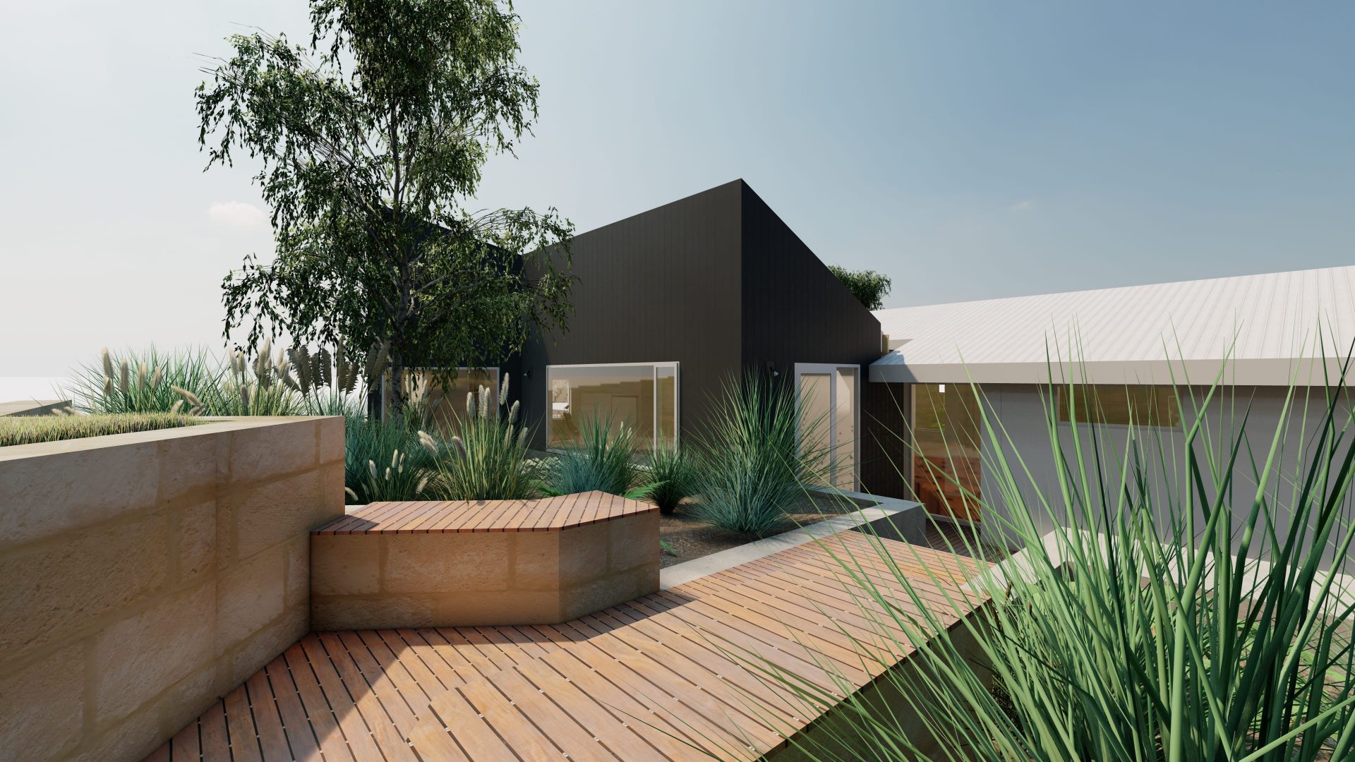The site in Wembley Downs featured a high topographic variance. Extensive integrated retention was firstly required at the rear of the property. Instead of simple mass retention, the design terraced the backyard, creating sections of garden, play space, lawn, pool and alfresco. Working with the odd geometry of the existing house, the landscaping is angled throughout, and allows for the preservation of massive existing trees. Retention was also integrated into the pool design, with the pool walls extending beyond the waterline.