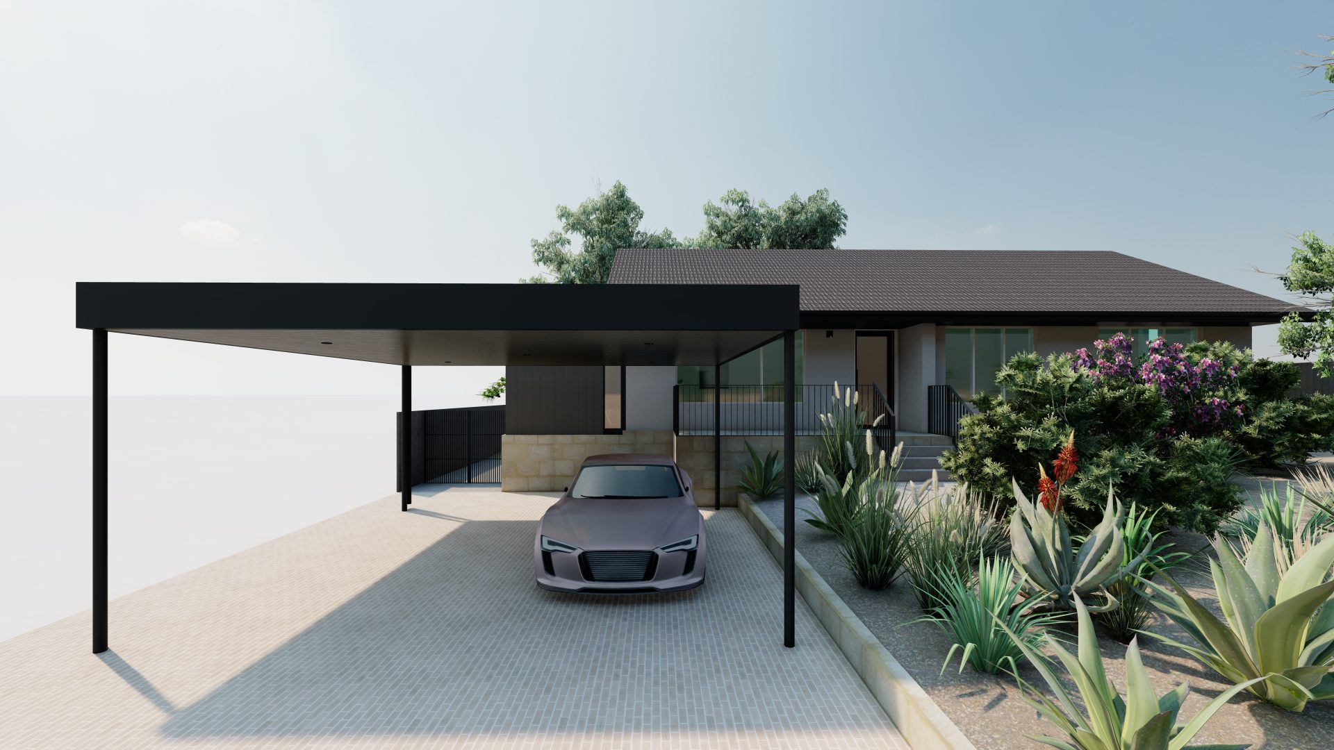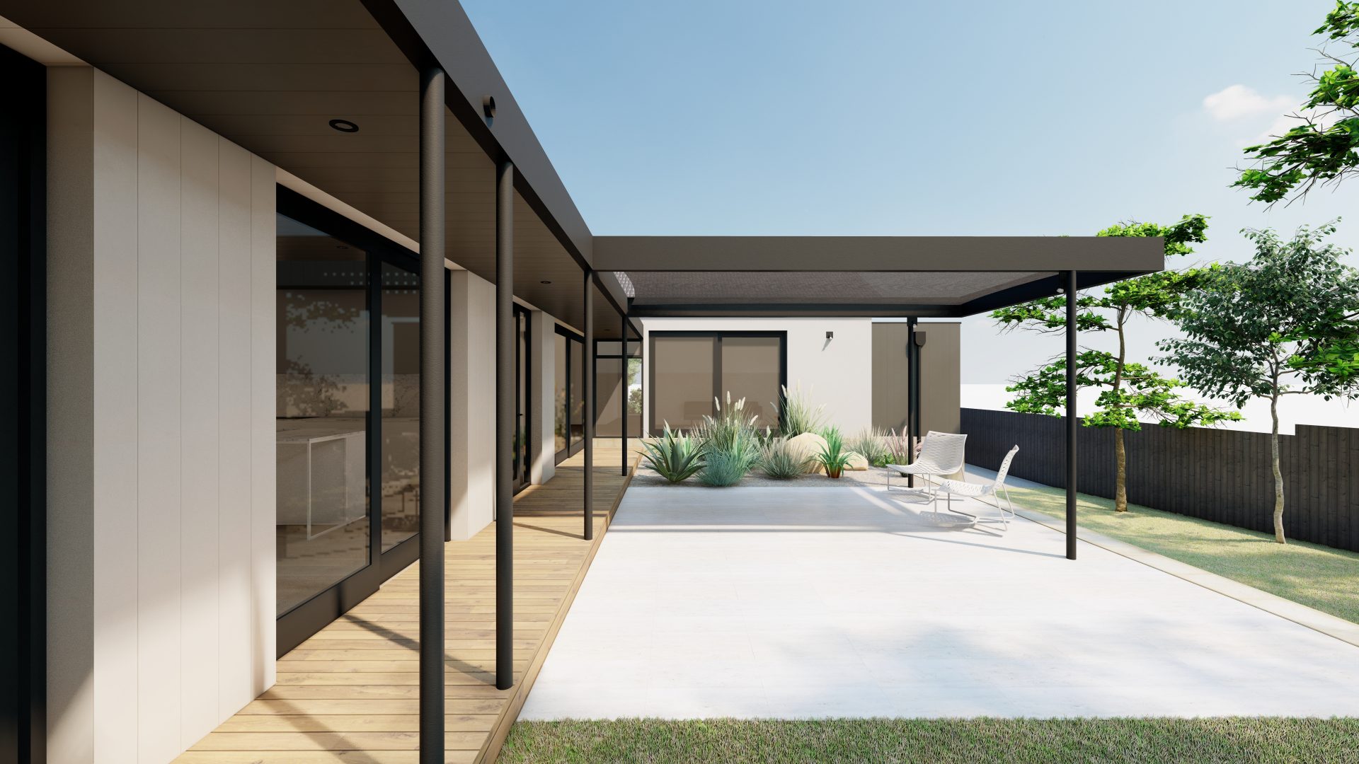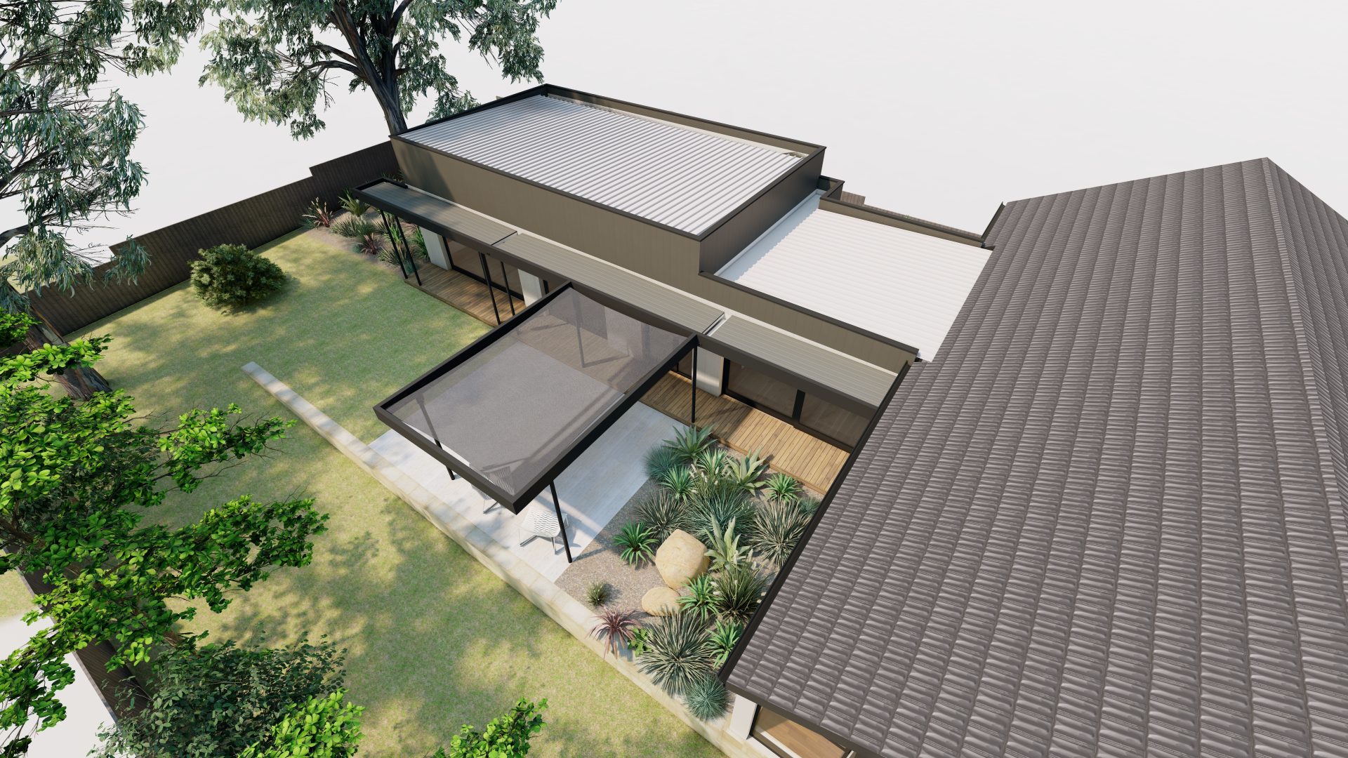 Connected to the existing residence with minimal impact to the existing roof structure, this addition utilizes the long axis of the block to optimize the northern aspect. This axis is emphasis upon entry, with the external patio roof extending form the line of the existing front door.